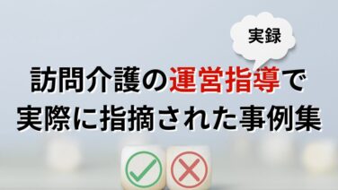 運営指導対策 【実録】訪問介護の運営指導で実際に指摘された事例集 訪問介護の運営指導で過去に実際に指摘された事例を一覧でまとめました。行政がチェックする具体的な不備ポイントを把握する参考にしてください。 2025.09.10 2025.11.14 運営指導対策